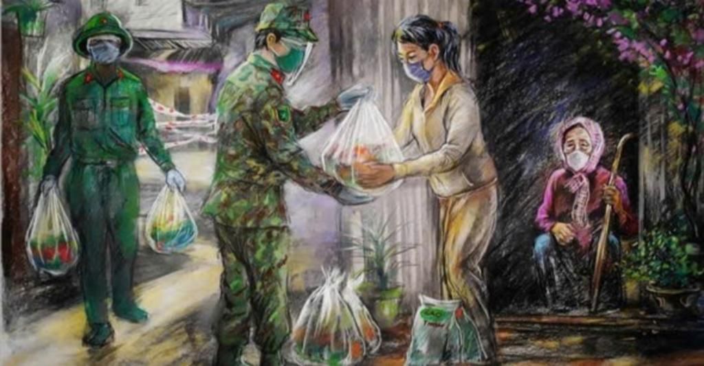 Tinh thần xung phong, không ngại khó khăn: Các chiến sĩ luôn có mặt trong mọi hoàn cảnh, từ chiến trường gian khổ đến thời bình, họ vẫn tiếp tục "chiến đấu" vì nhân dân. Trong bức tranh, họ xuất hiện như những người hùng thầm lặng, đem tình thương và nhu yếu phẩm đến từng gia đình giữa đại dịch.