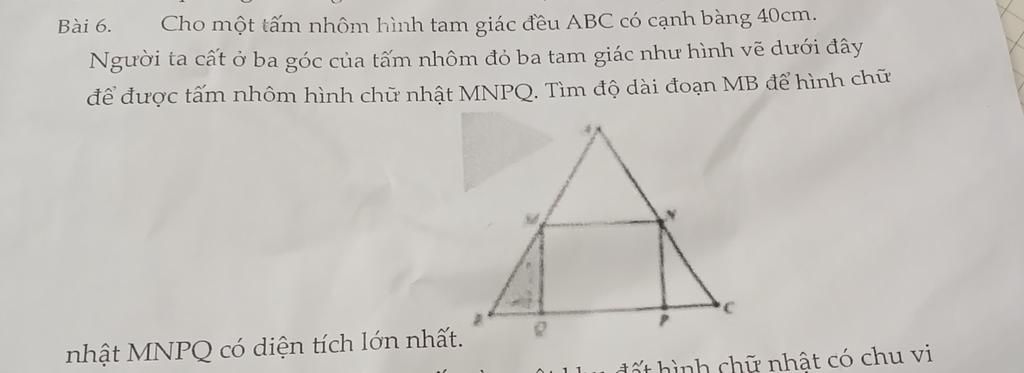 để được tấm nhôm hình chữ nhật MNPQ. Tìm độ dài đoạn MB để hình chữ