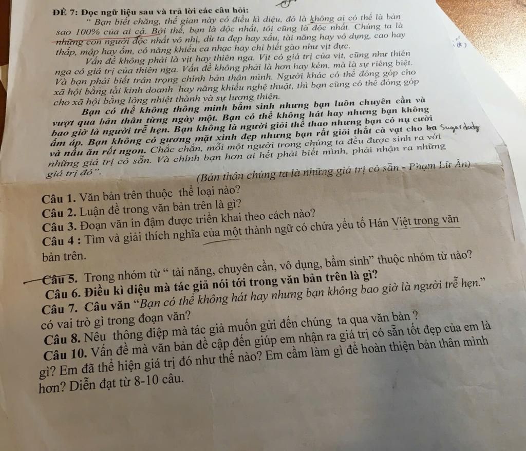 ĐỀ 7: Đọc ngữ liệu sau và trả lời các câu hỏi: