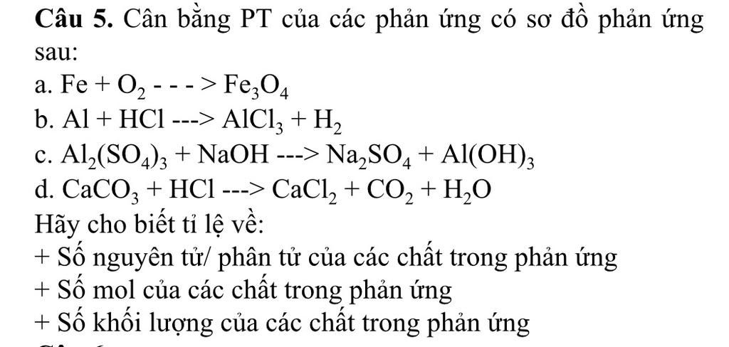 Câu 5. Cân bằng PT của các phản ứng có sơ đồ phản ứng