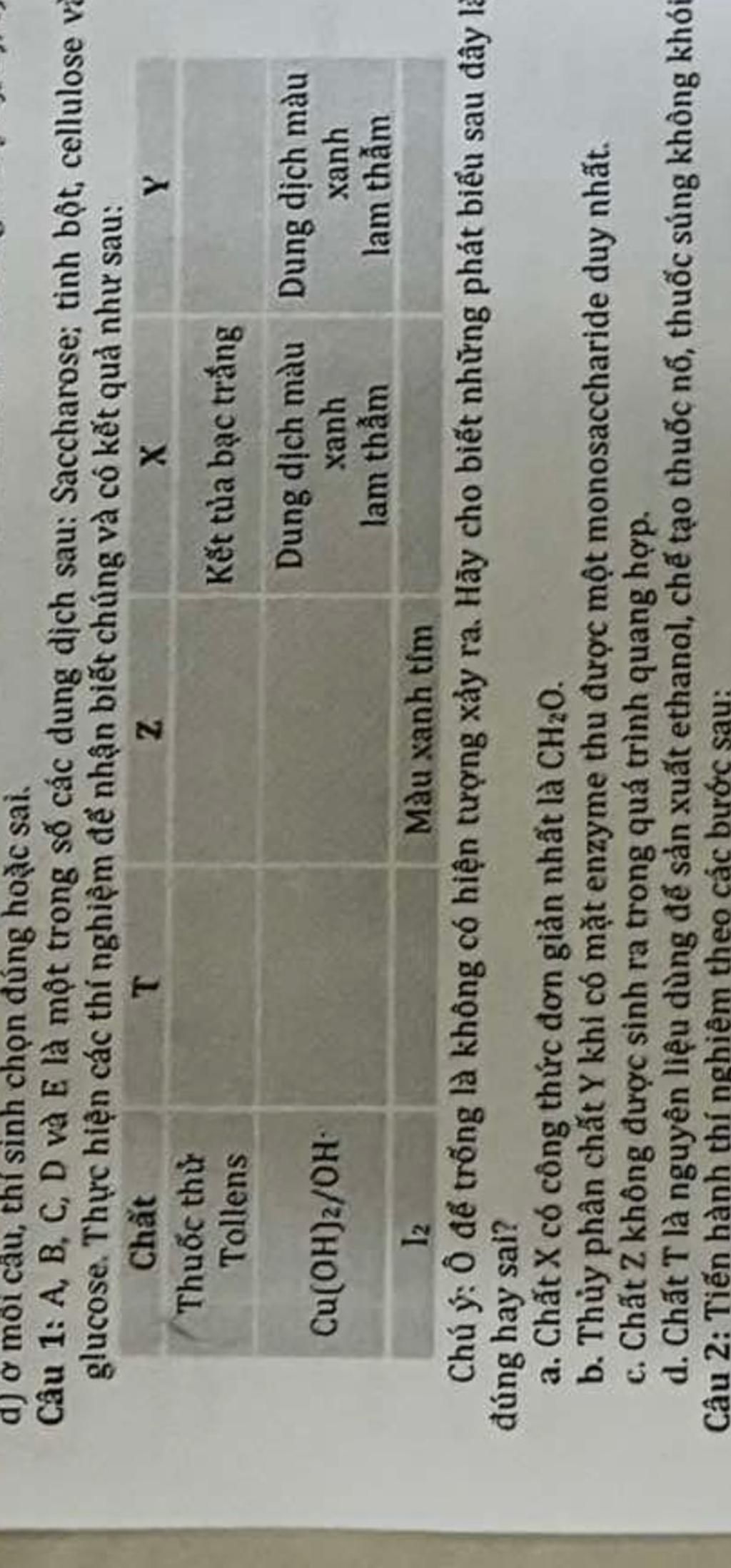 `T` không có hiện tượng gì sau tất cả thí nghiệm `=>` Cellulose.