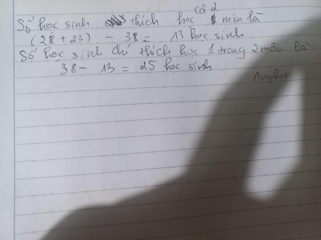 lớp 10A có 38 học sinh đều thích môn toán hoặc lí, trong đó có 28 học sinh thích học môn toán, 23 học sinh thích học môn lí. hỏi có bnh hs chỉ thích học 1 trong 2 môn