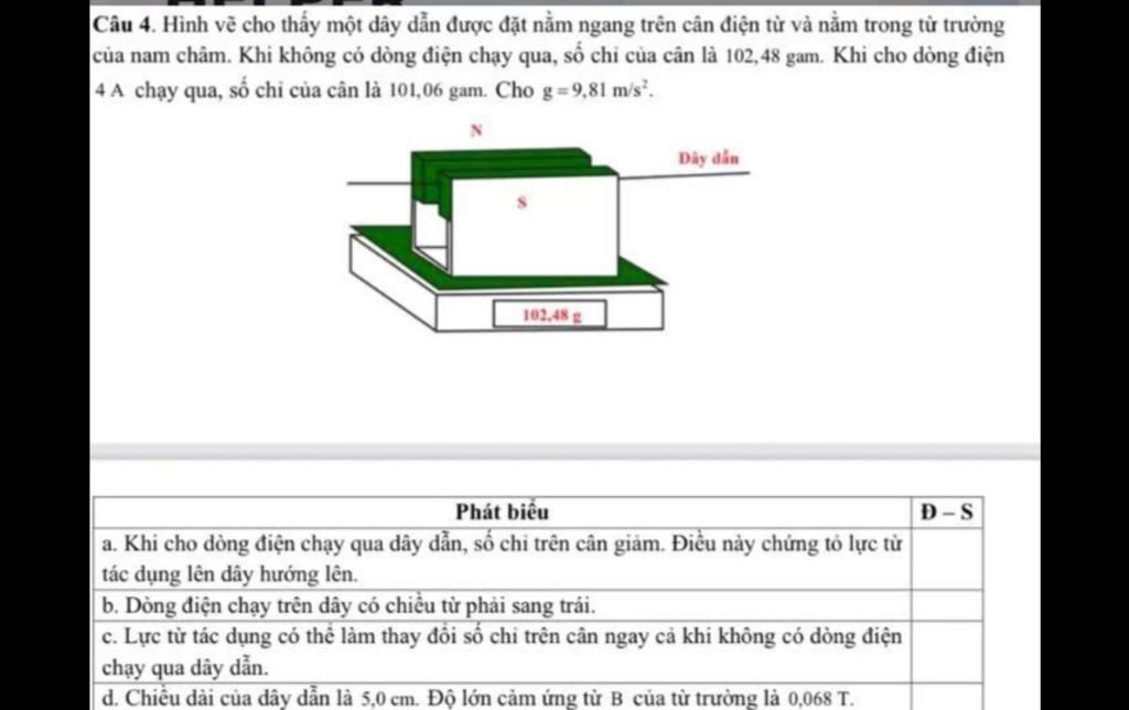 a) Do số chỉ của cân giảm nên chứng tỏ có lực tác dụng hướng từ dưới lên trên. Đó là lực từ