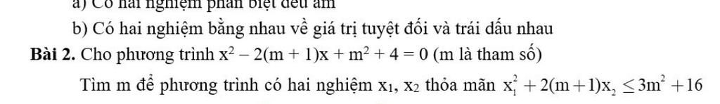 Tìm m để phương trình có hai nghiệm X1, X2 thỏa mãn x +2(m+1)x, <3m+16