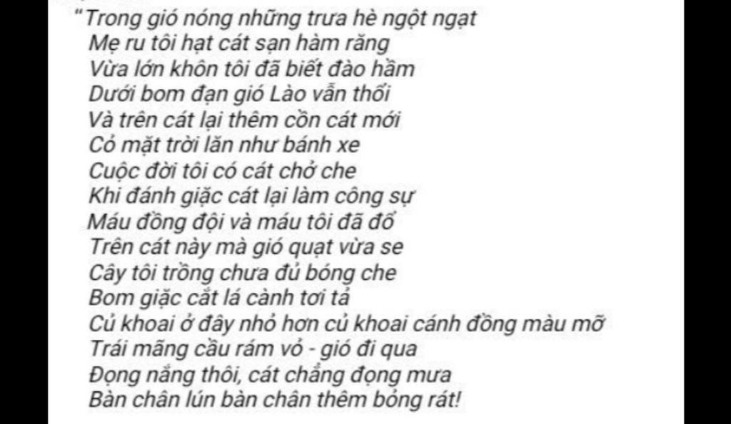 Đoạn thơ đã khắc họa tình yêu quê hương sâu nặng của nhân vật trữ tình gắn với những kỷ niệm tuổi thơ và những năm tháng chiến tranh gian khổ. Tình cảm ấy được thể hiện rõ nét qua hình ảnh "hạt cát sạn hàm răng" khi mẹ ru con giữa trưa hè ngột ngạt. Hạt cát nhỏ bé, bình dị ấy trở thành biểu tượng của quê hương khắc sâu vào ký ức tuổi thơ. Không chỉ là nơi chôn rau cắt rốn, quê hương còn là nơi chở che, bảo vệ người lính trong những năm tháng chiến tranh. Cát trở thành công sự, là nơi máu xương đồng đội và của chính tác giả đã đổ xuống. Dù bom đạn, gió Lào khắc nghiệt, quê hương vẫn là nơi "có cát chở che", là nơi tác giả "trồng cây", dù "chưa đủ bóng che" nhưng vẫn kiên cường bám trụ. Tuy nhiên, quê hương trong ký ức vẫn hiện về với "củ khoai cánh đồng màu mỡ", "trái mãng cầu rám vỏ" - những hình ảnh tươi đẹp, trù phú đối lập với hiện thực bom đạn, cát nóng bỏng rát. Qua đó, ta thấy được tình yêu quê hương tha thiết, vừa gắn với kỷ niệm êm đềm, vừa mang theo nỗi đau mất mát của chiến tranh nhưng vẫn tràn đầy hy vọng vào tương lai.