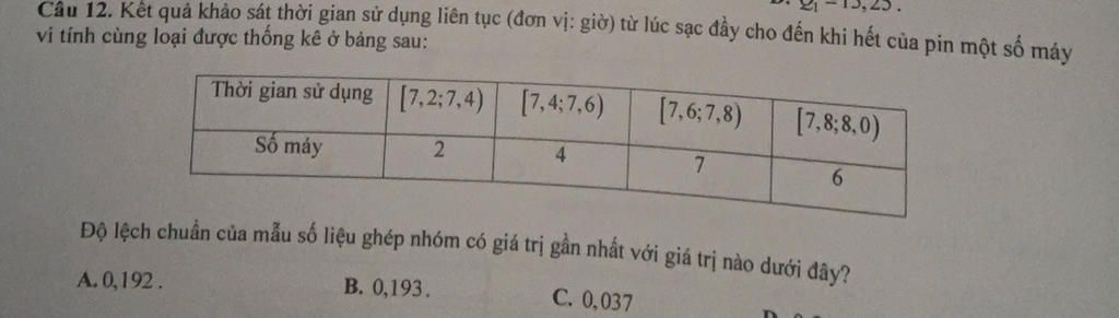 Câu 12. Kết quả khảo sát thời gian sử dụng liên tục (đơn vị: giờ) từ lúc sạc đầy cho đến khi hết của pin một số máy