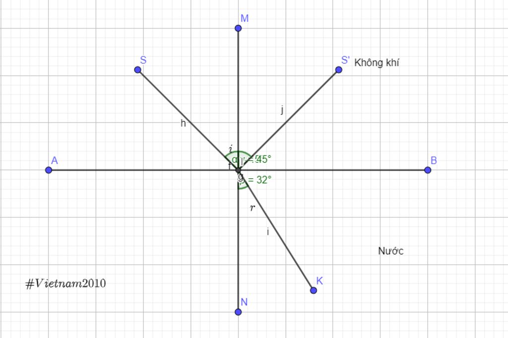 `=>n_(text{nước})=(sin 45^0 *1)/(sin 32^0)~~1,33`