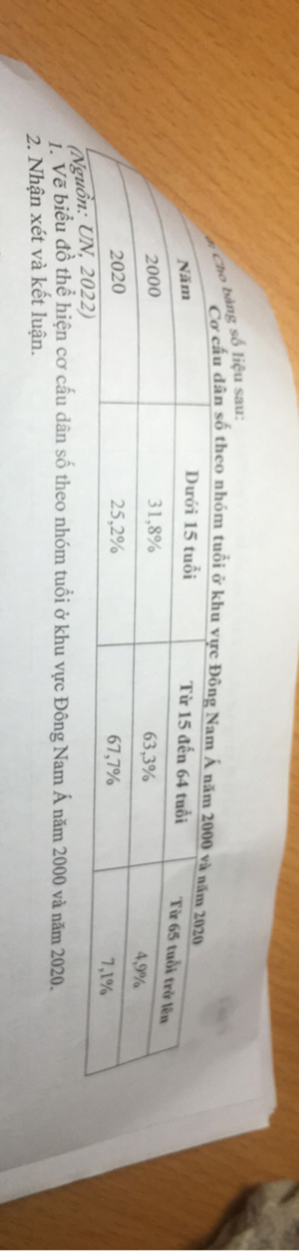 Vẽ biểu đồ thể hiện cơ cấu dân số theo nhóm tuổi ở khu vực ĐNA năm 2000 và năm 2020