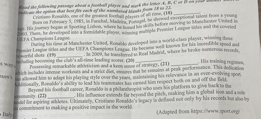 Read the following passage about a football player and mark the letter A, B, C or D on your