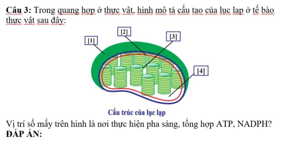 Pha sáng của quang hợp, nơi tổng hợp ATP và NADPH, xảy ra ở màng thylakoid, tức là ở vị trí số 3 ở hình