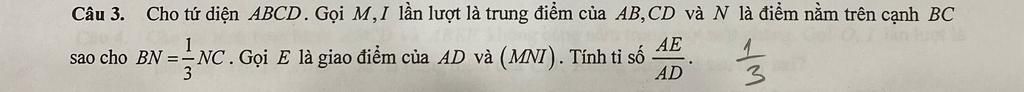1 Xét tam giác ABC. Ta có N thuộc BC sao cho BN = 1/3 * NC Áp dụng định lý Menelaus cho tam giác ABC với đường thẳng MNI, ta có: