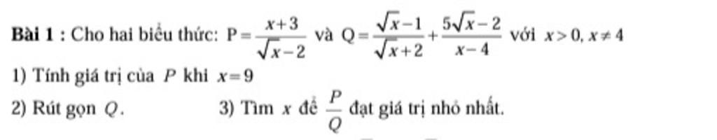 Ta có: `P/Q = (x + 3)/(\sqrt{x} - 2) : (\sqrt{x})/(\sqrt{x} -2 )`