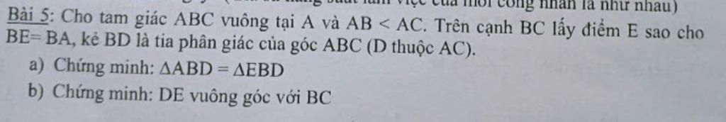 `hat{ABD}` = `hat{EBD}` ( `BD` là tia phân giác cuat `hat{ABC}` )