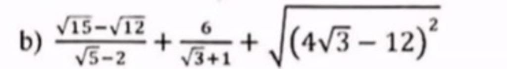 `b, (\sqrt{15} - \sqrt{2})/(\sqrt{5} - 2) + 6/(\sqrt{3} + 1) + \sqrt{(4\sqrt{3} -1 2)^2}`