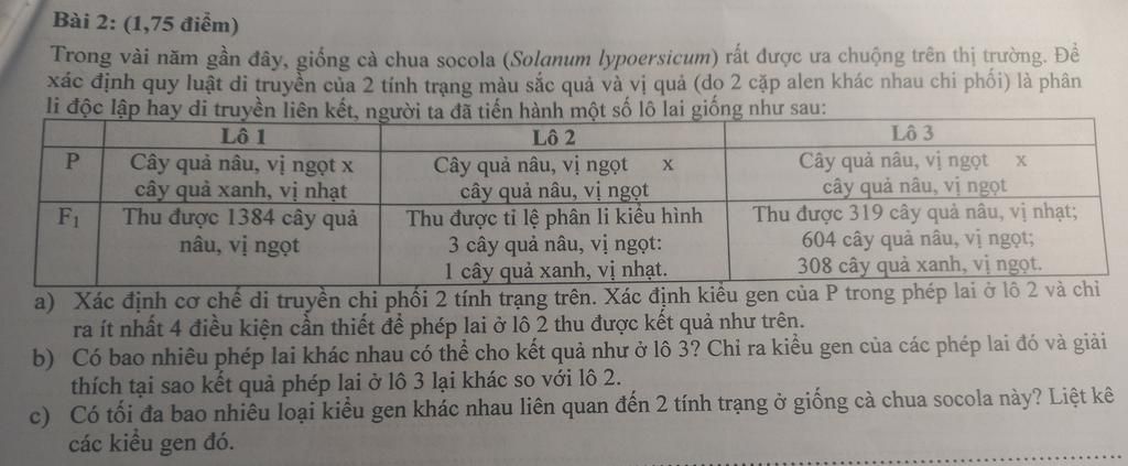 a) Cơ chế di truyền là phân li độc lập. Kiểu gen của P ở lô 2 là AABB x aabb. 4 điều kiện cần thiết: 1. Di truyền theo quy luật phân li độc lập. 2. Quá trình giảm phân diễn ra bình thường. 3. Sự thụ tinh ngẫu nhiên. 4. Số lượng cá thể đủ lớn để thể hiện đúng tỉ lệ. Đáp án: Phân li độc lập; AABB x aabb