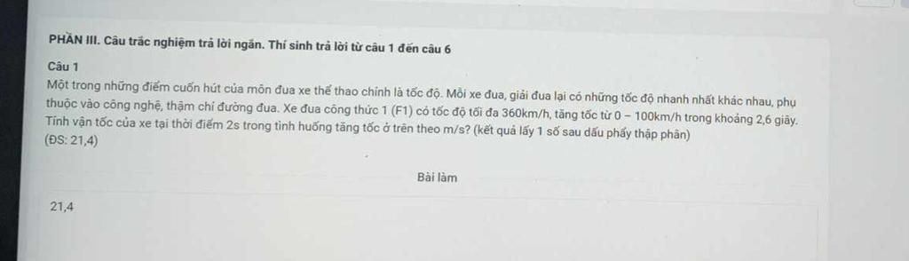 Lại có : `v_{1} = v_{0} + at = 0 + 1250/117 . 2 = 2500/117 ≈ 21,37` $m/s$