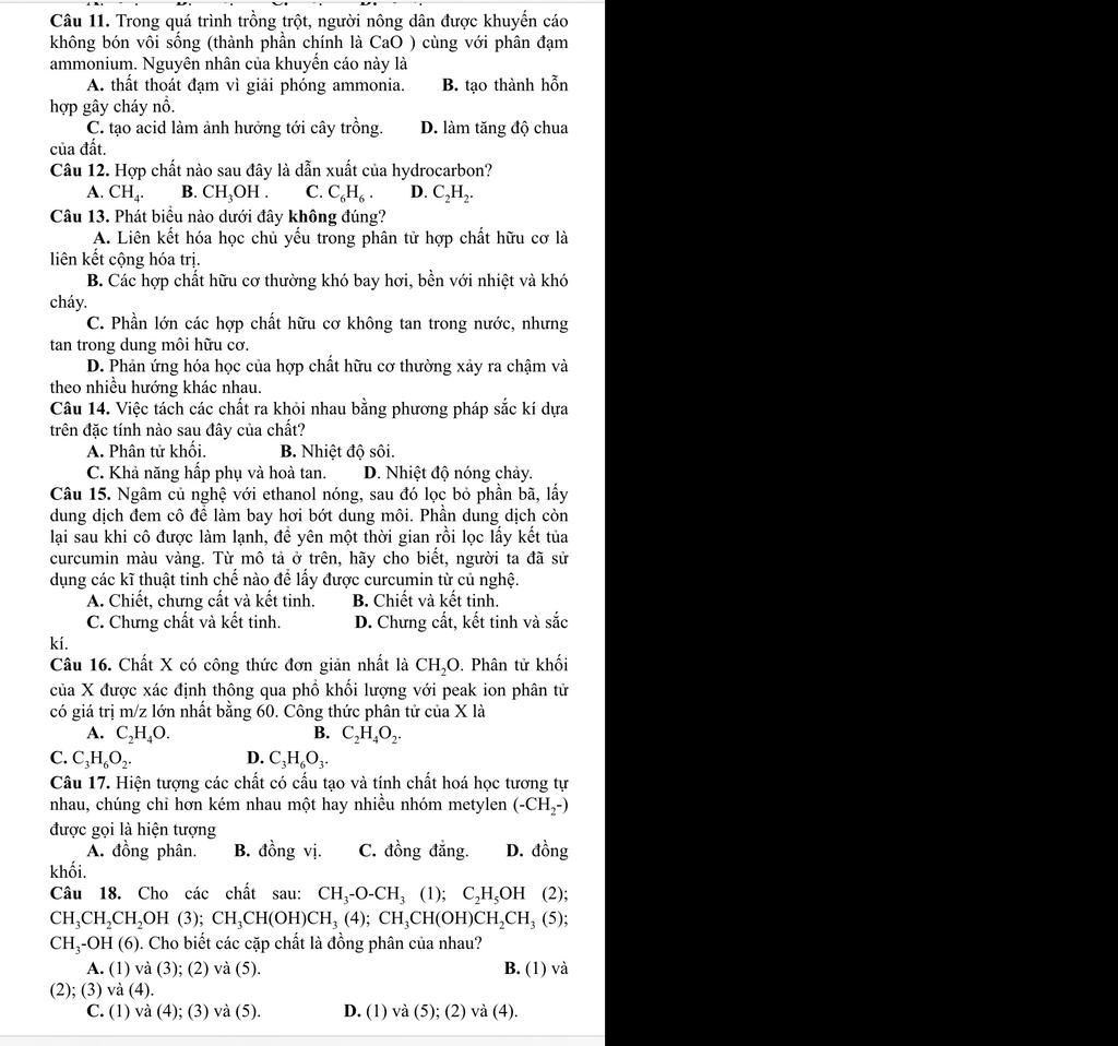 Câu 18: Đồng phân là những chất có cùng công thức phân tử nhưng khác công thức cấu tạo