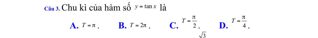 Chu kì của hàm số `y=tan x` là `T= pi`