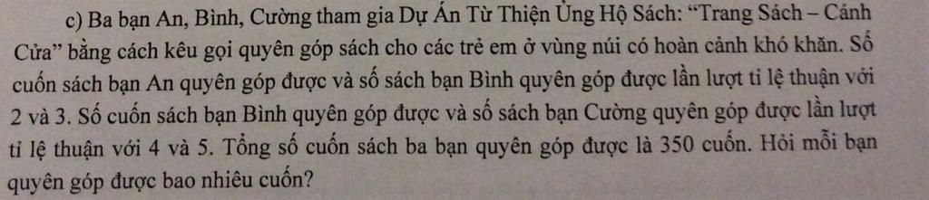 Gọi số sách bạn An, Bình, Cường quyên góp được là $a,b,c$ quyển, $(a,b,c\in N^*)$