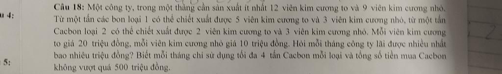 Câu 18: Một công ty, trong một thắng cần sản xuất ít nhất 12 viên kim cương to và 9 viên kim cương nhỏ.