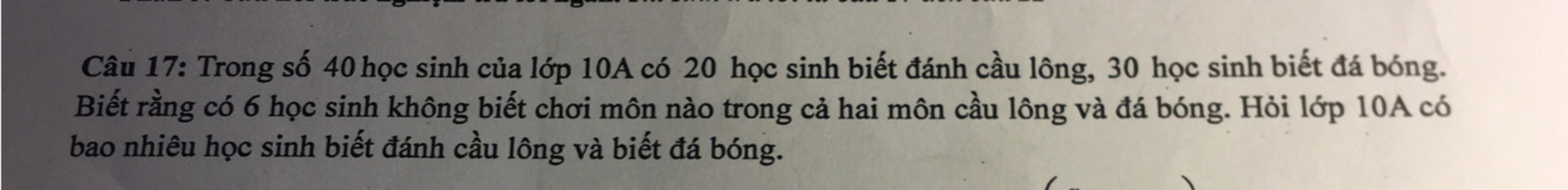 Trong số 40 học sinh của lớp 10A có 20 học sinh biết đánh cầu lông, 30 học sinh biết đá bóng. Biết rằng có 6 học sinh không biết chơi môn nào trong cả 2 môn cầu lông và đá bóng. Hỏi lớp 10A vó bao nhiêu học sinh biét đánh cầu lông và đá bóng