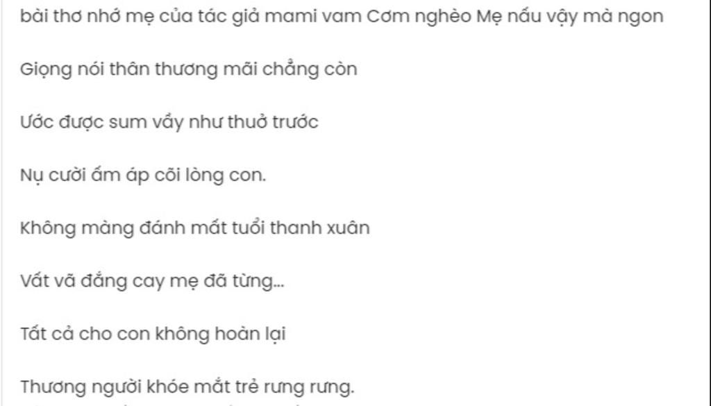 -Bài thơ "Nhớ mẹ" của tác giả Mami Vam thể hiện mạch cảm xúc từ sự nhớ nhung, tri ân đến tình yêu vô bờ bến của người con dành cho mẹ. Mở đầu, tác giả miêu tả những kỷ niệm ấm áp bên mẹ với "cơm nghèo mẹ nấu vậy mà ngon" và "giọng nói thân thương mãi chẳng còn". Tình cảm nhớ mẹ sâu sắc được thể hiện qua những ước muốn trở lại thời thơ ấu và sự tiếc nuối vì không còn được bên mẹ. Những hy sinh thầm lặng của mẹ như "không màng đánh mất tuổi thanh xuân" và "tất cả cho con không hoàn lại" khắc sâu trong lòng người con. Cảm xúc kết thúc bằng sự thương nhớ khôn nguôi và lòng biết ơn vô hạn với mẹ.