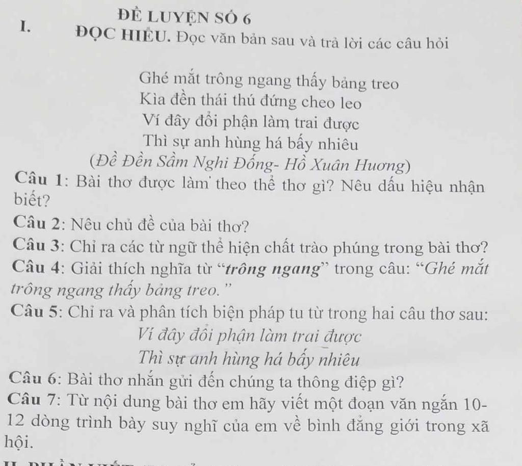 Câu 1: Bài thơ được làm theo thể thơ gì? Nêu dấu hiệu nhậ ...