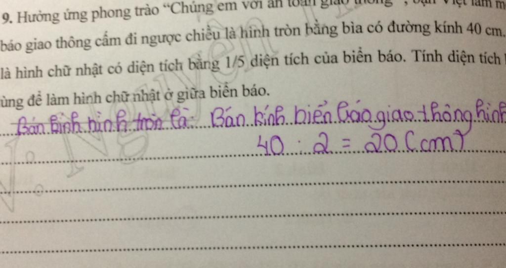 9. Hưởng ứng phong trào “Chúng em với an toàn giao thông", bạn Việt [...] báo giao thông cấm đi ngược chiều là hình tròn bằng bìa có đường kính 40 cm, ở giữa là hình chữ nhật có diện tích bằng 1/5 diện tích của biển báo. Tính diện tích dùng để làm hình chữ nhật ở giữa biển báo Rút gọn9. Hưởng ứng phong trào “Chúng em với an toàn giao thông", bạn Việt [...] báo giao thông cấm đi ngược chiều là hình tròn bằng bìa có đường kính 40 cm, ở giữa là hình chữ nhật có diện tích bằng 1/5 diện tích của biển báo. Tính diện tích dùng để làm hình... xem thêm