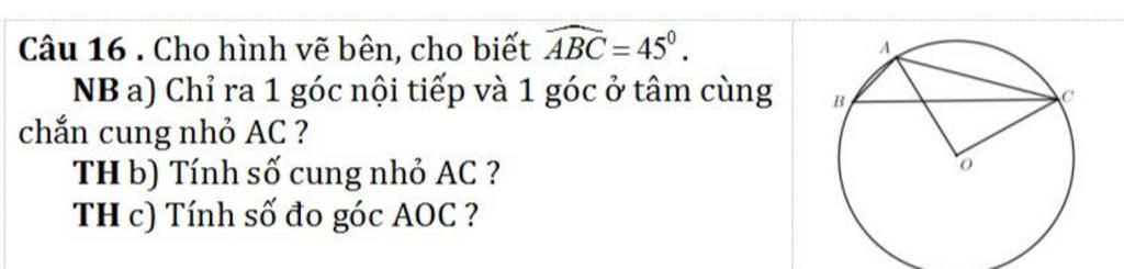 b.Ta có: $sđ(AC)=\widehat{AOC}=2\widehat{ABC}=90^o$