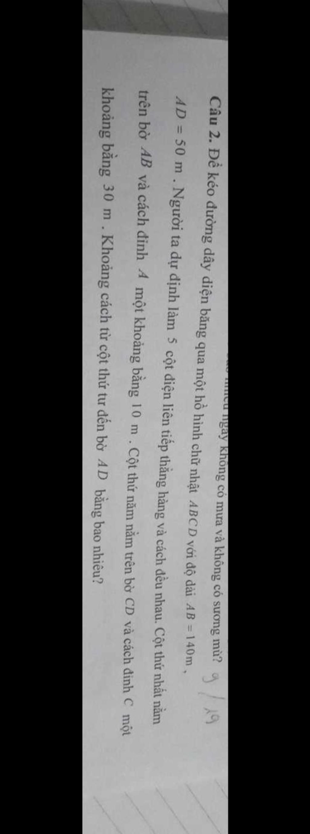 Câu 2. Để kéo đường dây diện băng qua một hồ hình chữ nhật ABCD với độ dài AB = 140m,