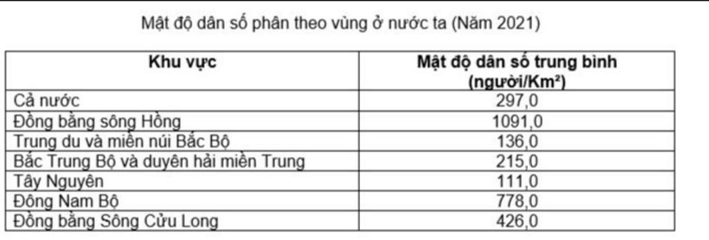 Mật độ dân số phân theo vùng ở nước ta (Năm 2021)