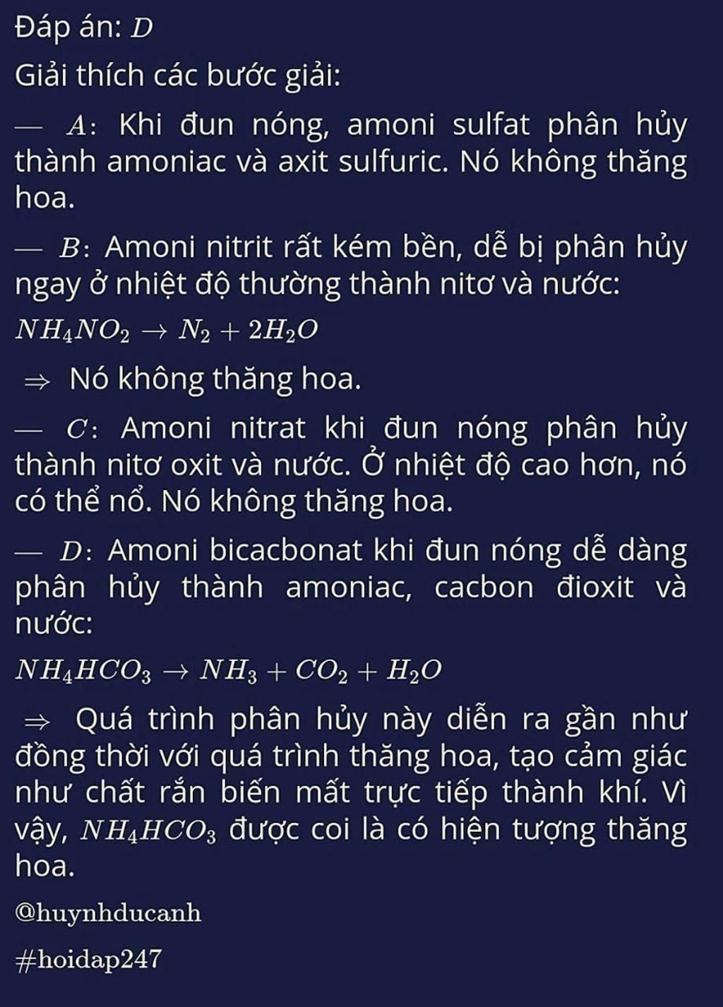 PTHH: `NH_4HCO_3` $\xrightarrow[]{t^o}$ `NH_3` + `CO_2` + `H_2O`