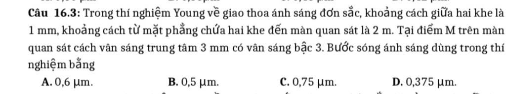\(\lambda = \dfrac{{ia}}{D} = \dfrac{{1.1}}{2} = 0,5\mu m\)