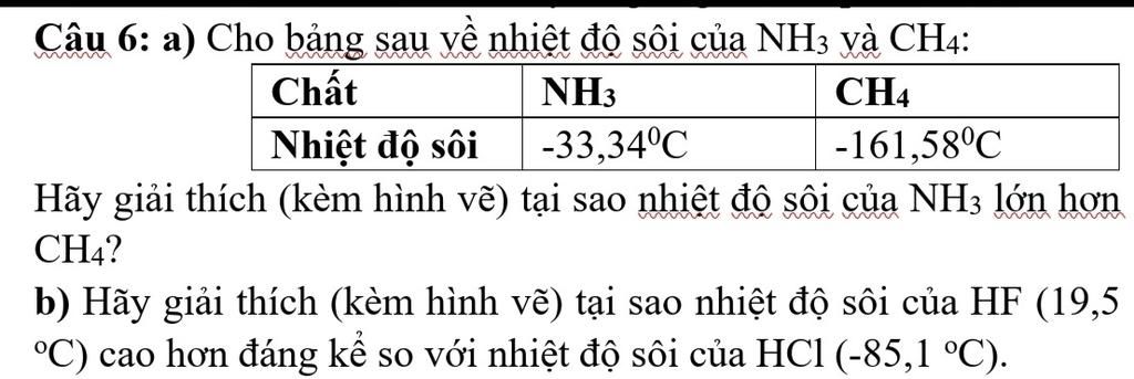 Nhiệt độ sôi của `NH_3` lớn hơn so với `CH_4` bởi vì giữa các phân tử `NH_3` có thể tạo được liên kết hydrogen với nhau còn `CH_4` thì không