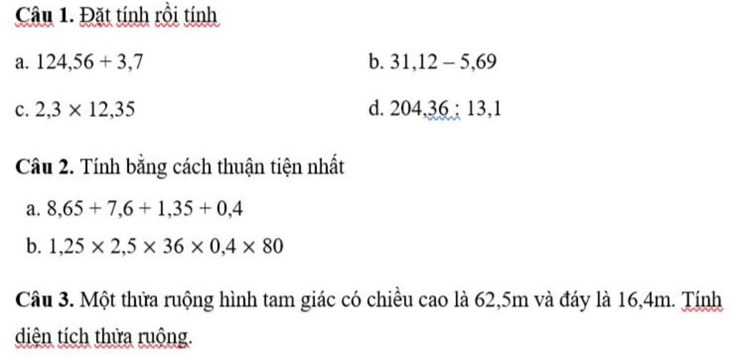 Câu 1. Đặt tính rồi tính