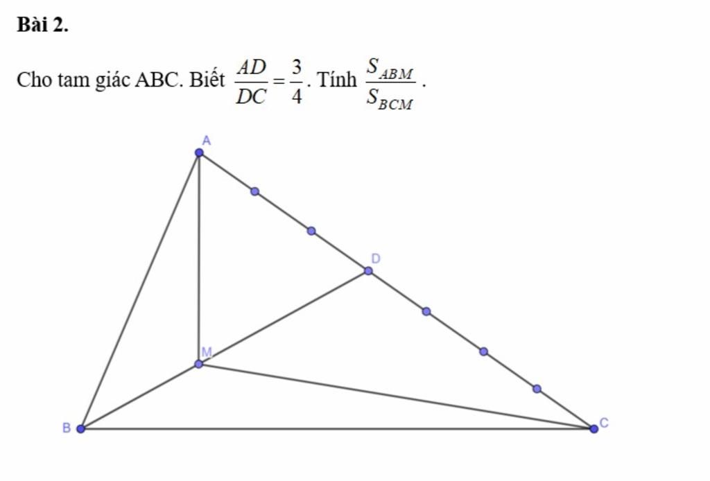 `S_{AMD}=3/4 S_{CMD}` vì có chung chiều cao hạ từ đỉnh đỉnh `M` xuống và đáy `AD=3/4 AC`