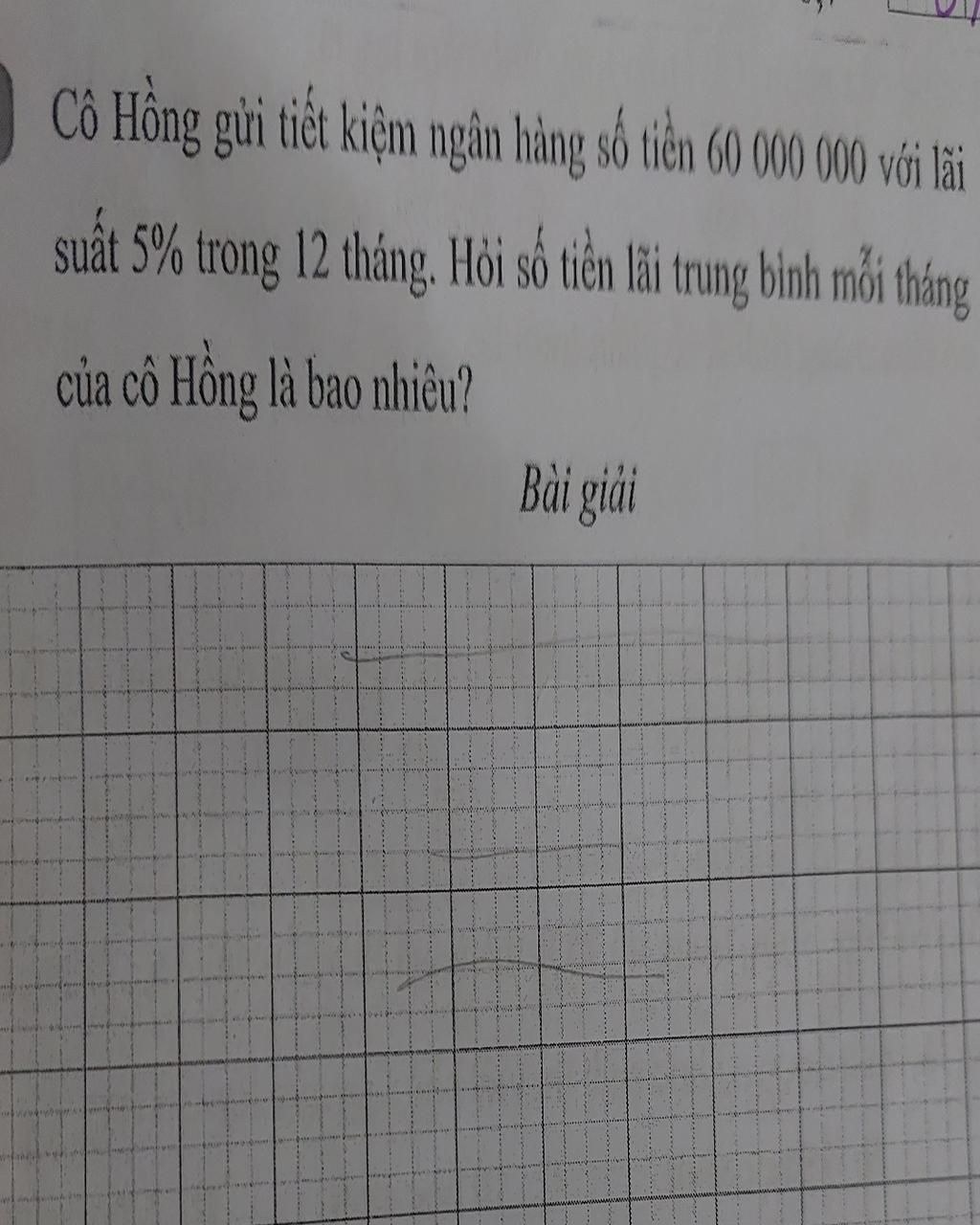 Số tiền lãi trong 12 tháng là : 60000000 x 5% =30000000 (đồng)