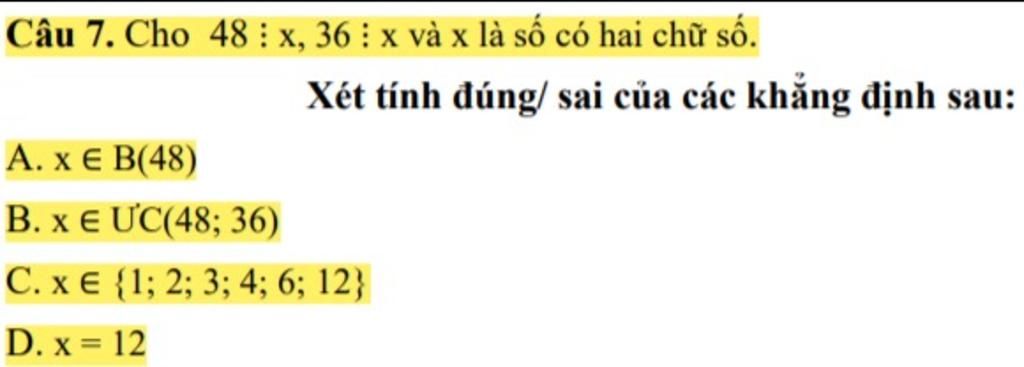 Câu A sai vì 48 chia hết cho X nên x là ước của 48
