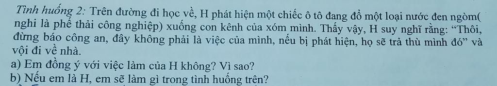 `+` `H` là một người thiếu trách nhiệm trong việc bảo vệ môi trường vì đã thấy một chiếc xe ô tô xả rác thải vào con kênh của xóm mà vẫn mặc kệ làm ngơ bỏ qua