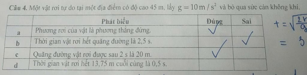 `t = sqrt{(2h)/g} = sqrt{(2.45)/10} = 3 (s)`