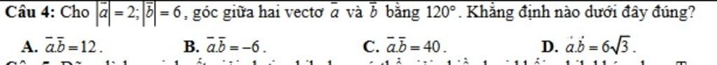 Ta được: a→ · b→ = 2 · 6 · cos120 độ = 2 · 6 · (-1/2) = -6.