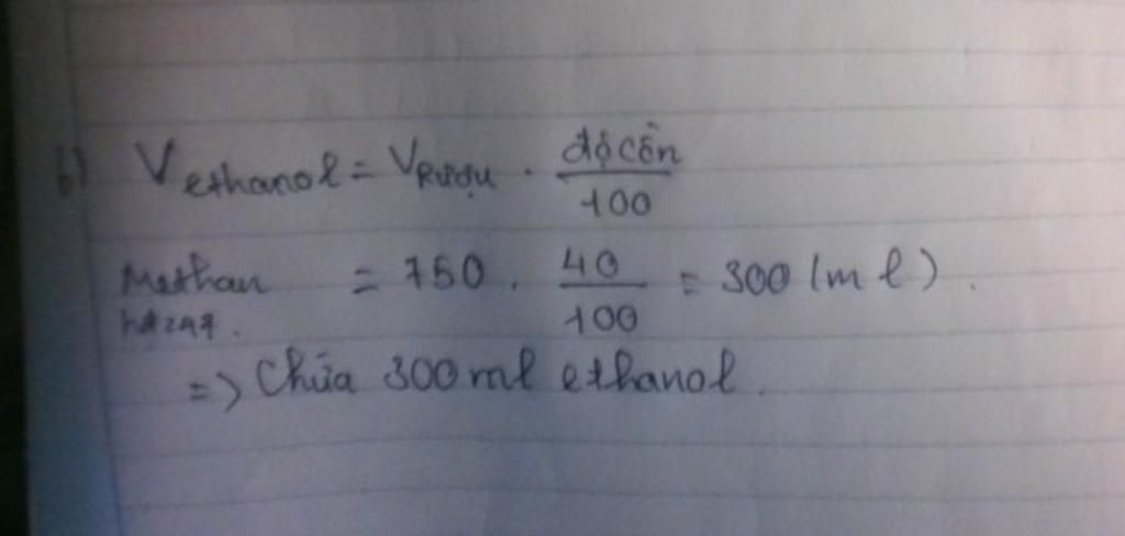 Vcồn etylic = V dung dịch xx (Độ cồn / `100)=750xx(40/100=300ml`