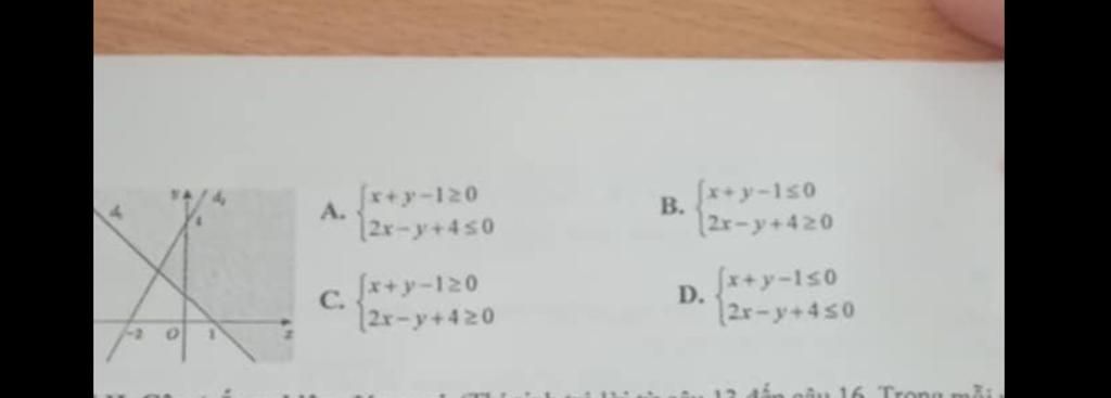 `D.2x-y+4<=0<=>2.(-1)-0+4<=0(VL)->Loại`