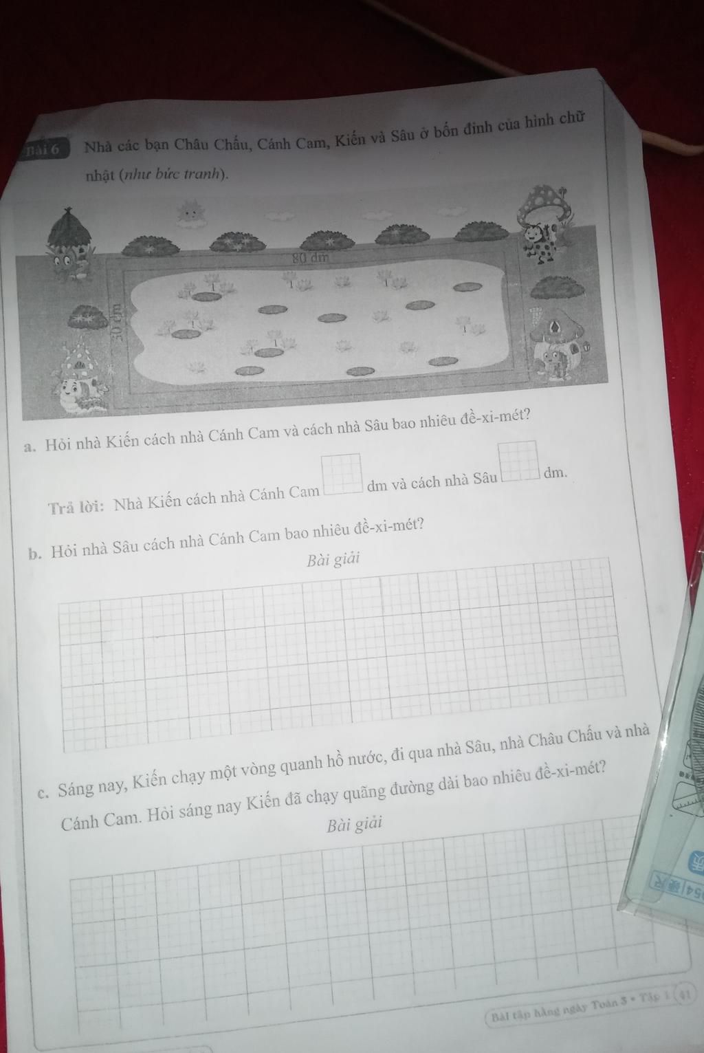 `***` Trả lời : Nhà Kiến cách nhà Cánh Cam `30`dm và cách nhà Sâu `80`dm.