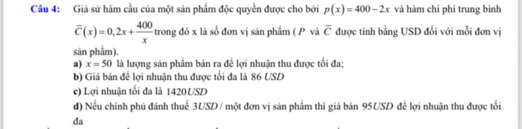 Giả sử hàm cầu của một sản phẩm độc quyền được cho bởi p(x)=400–2x và hàm chi phí trung bình