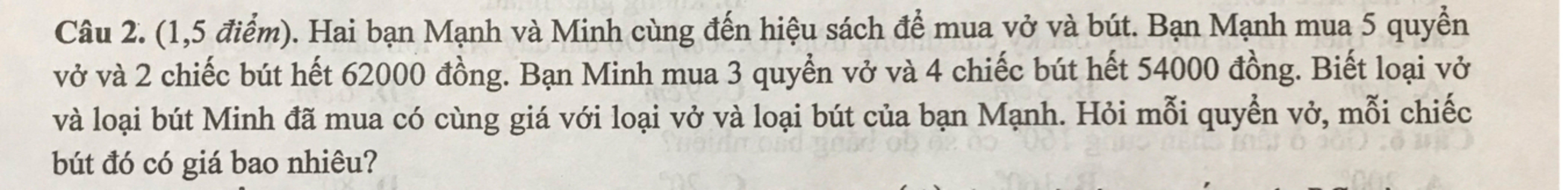 Gọi giá mỗi quyển vở, mỗi cái bút lần lượt là $x,y$ nghìn đồng, $(x,y>0)$