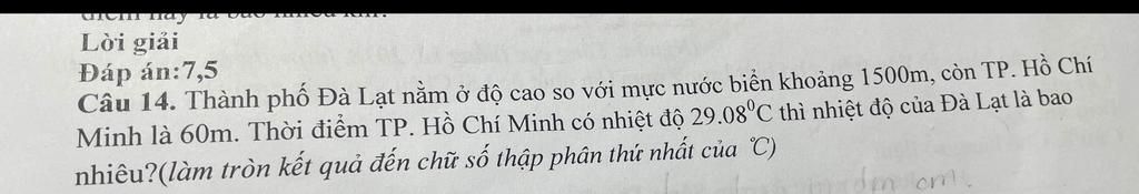 Câu 14. Thành phố Đà Lạt nằm ở độ cao so với mực nước biển khoảng 1500m, còn TP. Hồ Chí