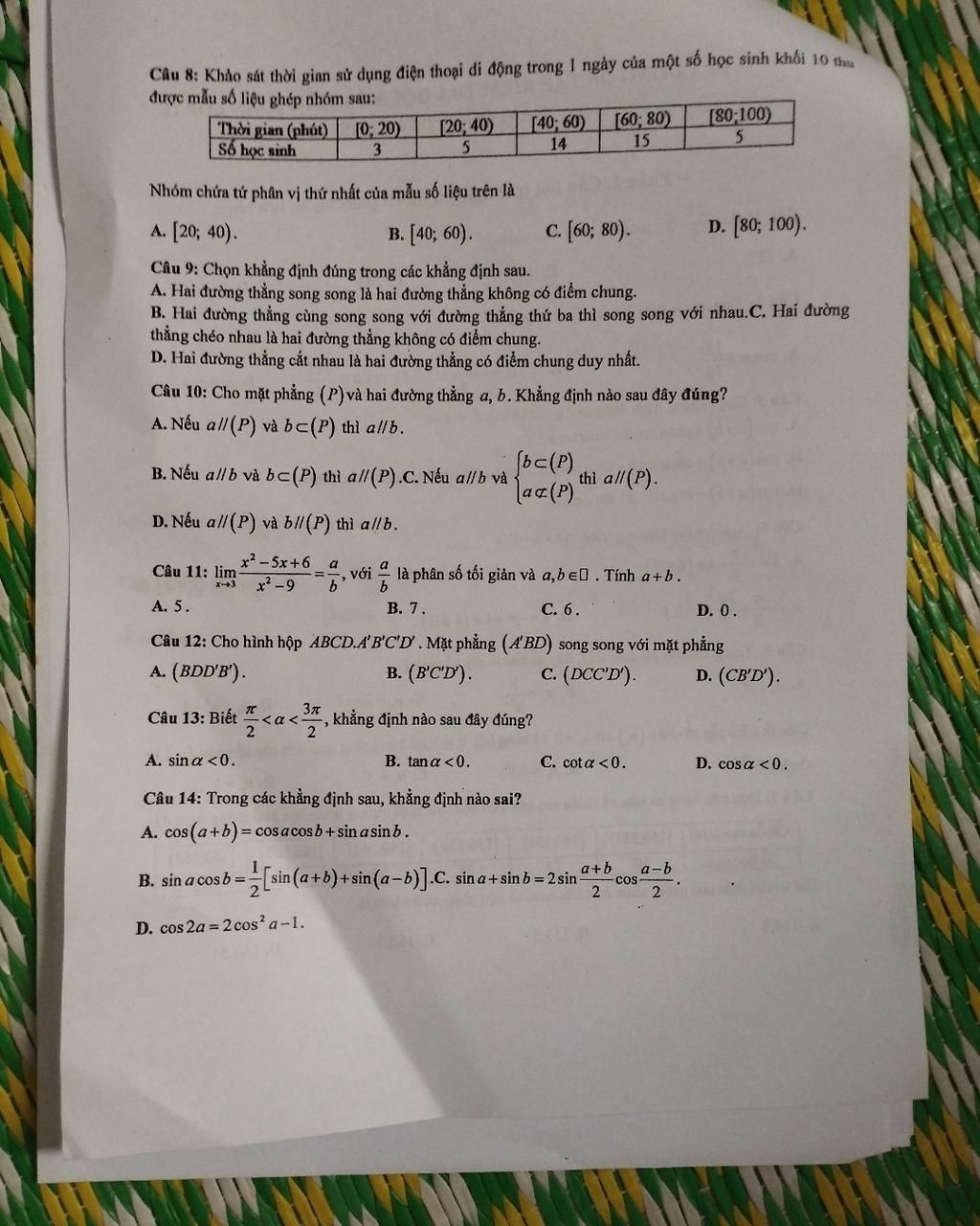Câu 8: Khảo sát thời gian sử dụng điện thoại di động trong 1 ngày của một số học sinh khối 10 thu