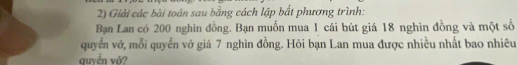 (200 - 18) : 7 = 26 ( quyển vở )