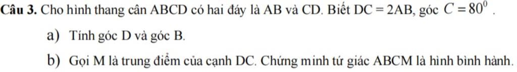 +) ∠D = ∠C = 80 độ ( 2 góc kề một đáy trong hình thang cân